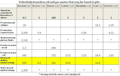 I was told by the TRC that they would test for such things as chlorides and benzene, and TPH (total percent of hydrocarbons). If these carcinogens aren’t commonly found in drilling mud, why are we testing for them?
