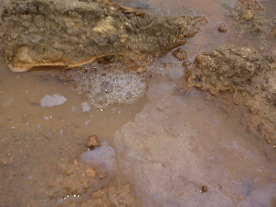 The recent rain caused a tiny puddle to form on the big hole that was the former pit. And you’ll never guess what’s happening in the tiny puddle: It’s bubbling and growing oily.