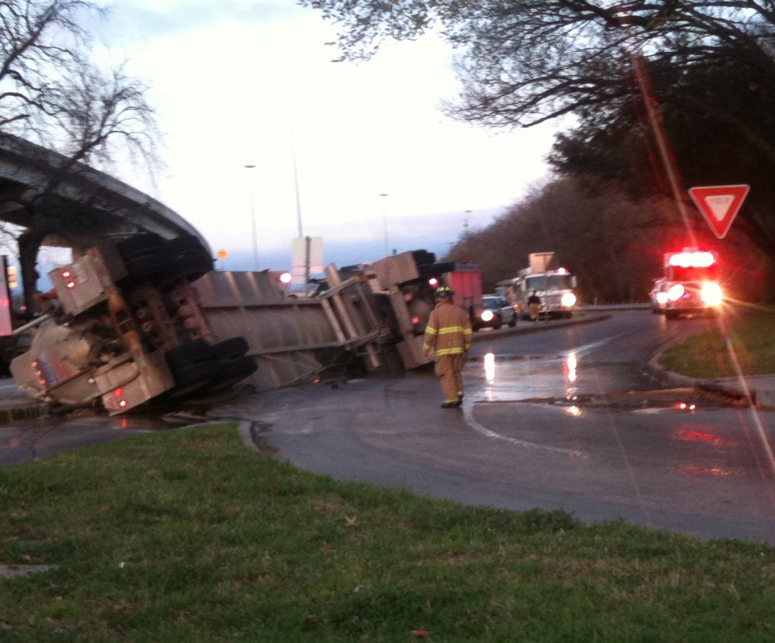 It's hard to make a final determination, but it looks as if no other cars were involved and the driver was just going to fast around the corner. If one of these speeding trucks kills someone, well, there WILL be hell to pay.