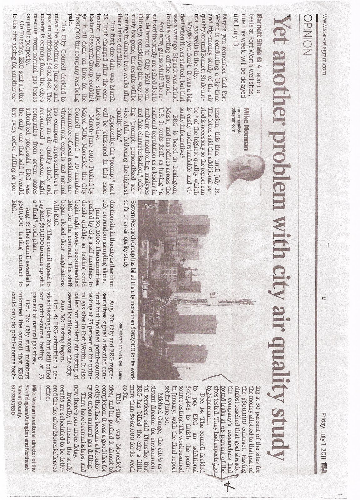 On page 15a of today’s Star-Telegram, Mike Norman reveals that the year long study of gas wells in Ft Worth found leaks at 68% of the sites rather than the 10-25% expected. The million dollar study examined 50% of the sites in Ft. Worth. The study is to be released on July 13th.
