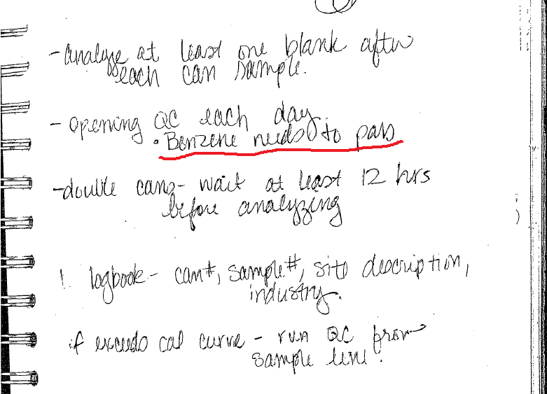 These notes appear to be in a female's hand writing. I wonder if we can take a look at any other writing on the part of either Shannon Ethridge, TCEQ's toxicologist or maybe even Susana Hildebrand, chief engineer for the air quality division and compare.